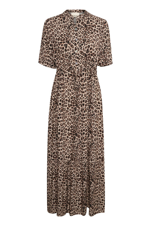 AViewn Katie Leo on tikattu takki, leopardikuosilla. Takissa on mustat hihat ja mustat taskut. Sidotaan kiinni vyötäröltä, leopardikuosisella vyöllä.