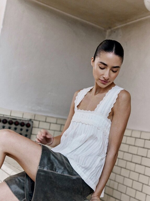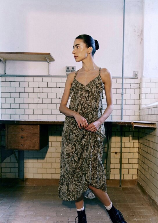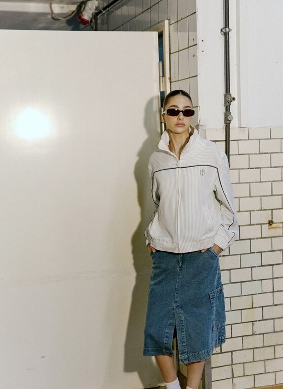 Materiaali on tekninen, verkkomainen polyesterineulos, joka on peräisin vaateteollisuuden ylijäämämateriaaleista. Kevyt ja hengittävä pinta antaa asuun ilmavuutta ja kerroksellista ilmettä.