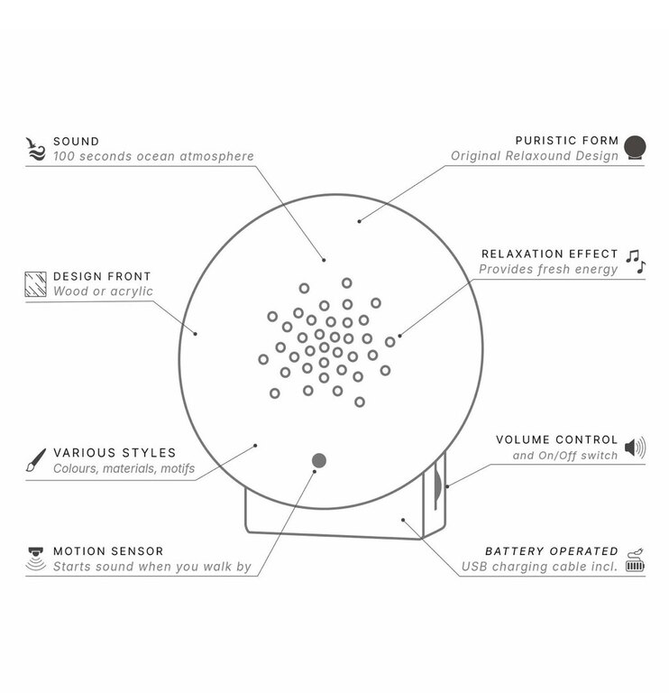 Oceanbox aktivoituu liikkeestä. Äänenvoimakkuus on portaattomasti säädettävissä. Kompaktin koon ja ladattavuuden ansiosta voit ottaa meren virkistävän energian mukaasi minne tahansa. Kylpyhuoneeseen tai olohuoneeseen, työpöydälle tai parvekkeelle; oma rantasi on nyt aina vain muutaman askeleen päässä.