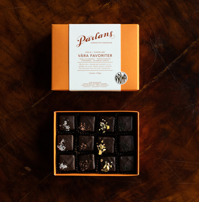 Ihastuttava rasia pehmeitä ja voisia karamelleja, jotka on kuorrutettu tummalla suklaalla – täydellinen lahja!