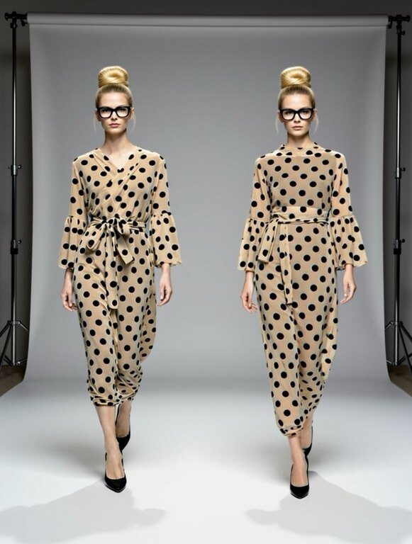 Mekossa on v-pääntie, jonka voi kääntää myös selkäpuolelle, ts. tätä mekkoa voi käyttää kumminkin päin. Hiha 3/4-pituinen, hihansuu avautuu salsatyylisesti. Mekossa on myös taskut ja mukana tulee vyö.
