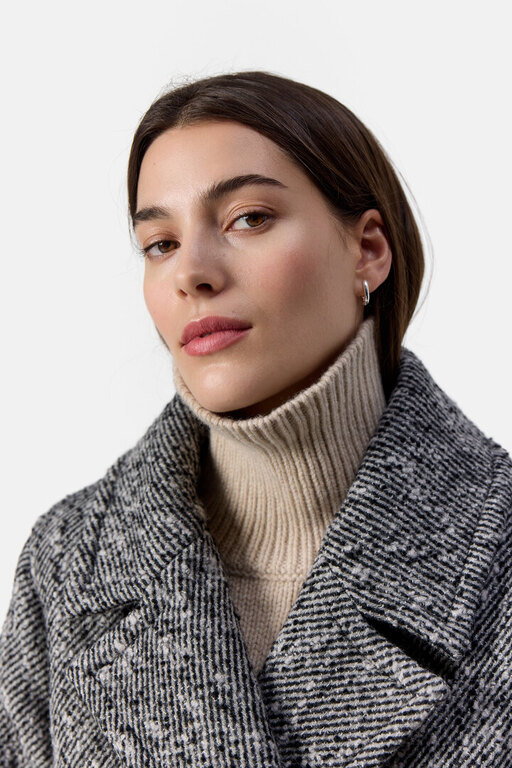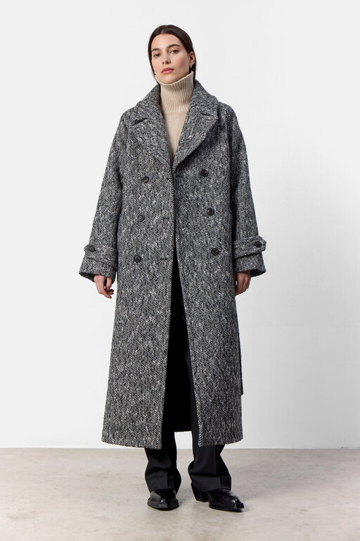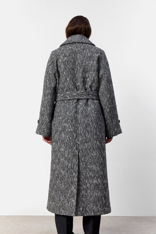 Pitkä, paksusta villakankaasta valmistettu takki. Takissa on trendikäs kalanruotokuvio, etutaskut, kaunis vyö naisellisen siluetin korostamiseksi sekä leveät bleiserikaulukset, jotka tuovat asuun tyylikkään yksityiskohdan. Ajaton suosikki vaihtuvaan vuodenaikaan. Materiaali 60% kierrätetty villa, 27% polyesteri, 6% polyamidi, 4% viskoosi, 3% akryyli. Väljä mitoitus.