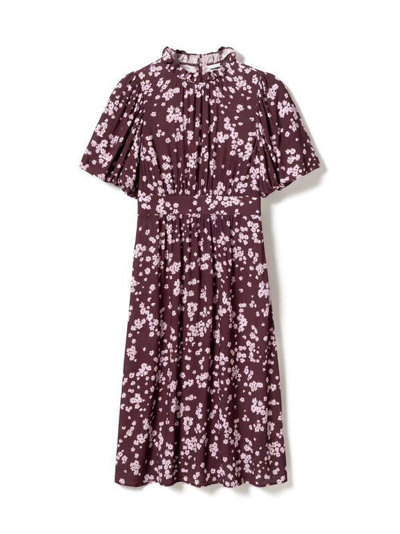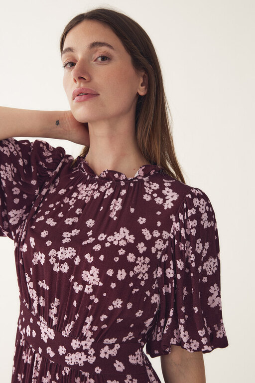 Ruth Dress on pitkä ja kauniisti laskeutuva mekko, jossa on kevyesti pussitetut hihat ja vartaloa imarteleva, korostettu vyötärö. Mekossa on röyhelökaulus ja kauttaaltaan kukkakuosi.