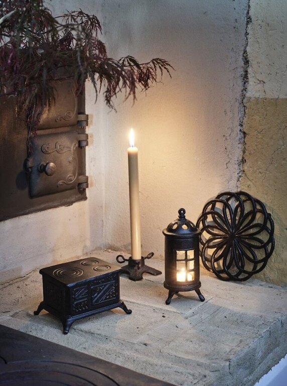 Koristeellinen Strömshagan miniuuni, mustaa valurautaa, suunniteltu muistuttamaan klassista puulämmitteistä keittiöuunia. Toimii sekä hurmaavana tuikkulyhtynä että käytännöllisenä lämmönlähteenä pienille astioille. Sopii täydellisesti glögimukin, pienen kattilan tai muiden juomien lämpimänä pitämiseen.
