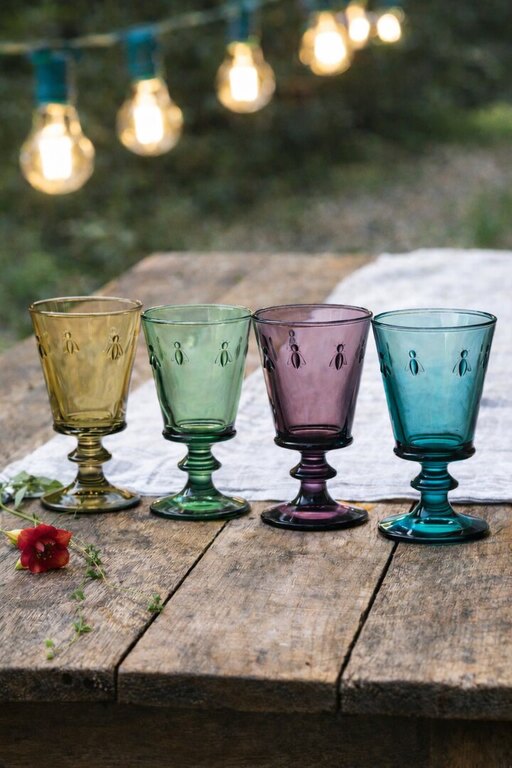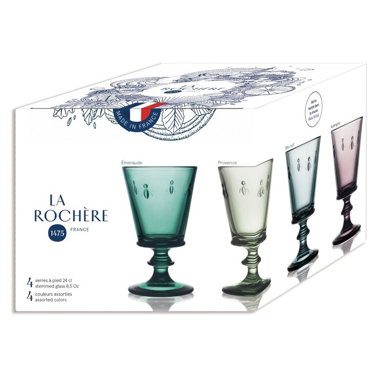 Ranskalaisen La Rochèren monivärinen Abeille-viinilasien 4 kappaleen lahjasetti. Laseja koristavat Napoleonin mehiläiset, ja ne sopivat punaviinille, valkoviinille ja roséviinille sekä mehulle, vedelle ja cocktaileille.