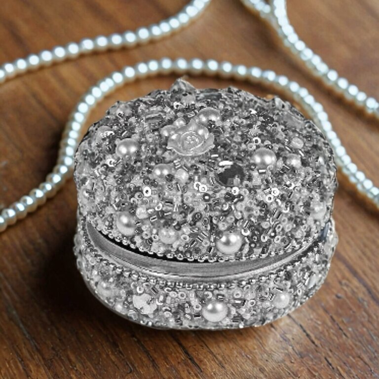 Kaunis, pieni helmillä koristeltu korurasia, materiaali alumiini, lasi, akryyli ja sametti. Halkaisija 7,5 cm, korkeus 5 cm.