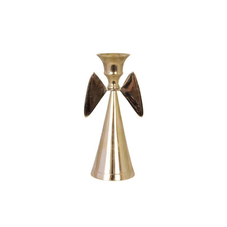 Korkea enkelinmuotoinen kynttilänjalka, valmistettu massiivimessingistä. Sopii antiikki- tai kruunukynttilöille. Messingin kullanhohtoinen sävy luo lämpimän ja klassisen ilmeen. Tämä kynttilänjalka on todellinen suosikki ja kaunis lahja, jota voi käyttää vuodesta toiseen. Täydellinen esimerkiksi kaste- tai joululahjaksi. Sopii hyvin yhteen matalamman mallin kanssa.