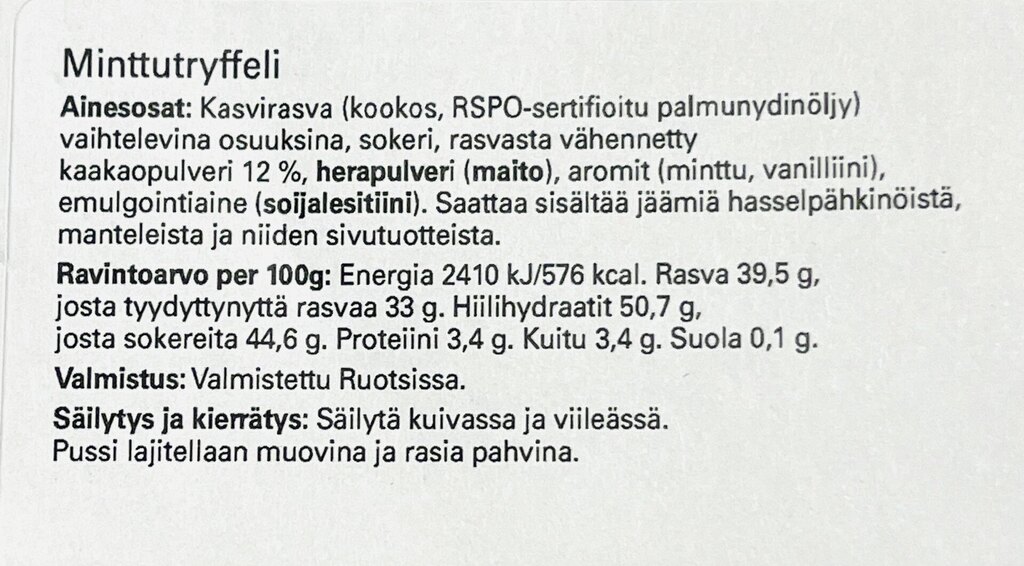 Ruotsalaisen Fran & Co:n suussasulavat, kaakaojauheessa dipatut suklaatryffelit. Makuna minttu.