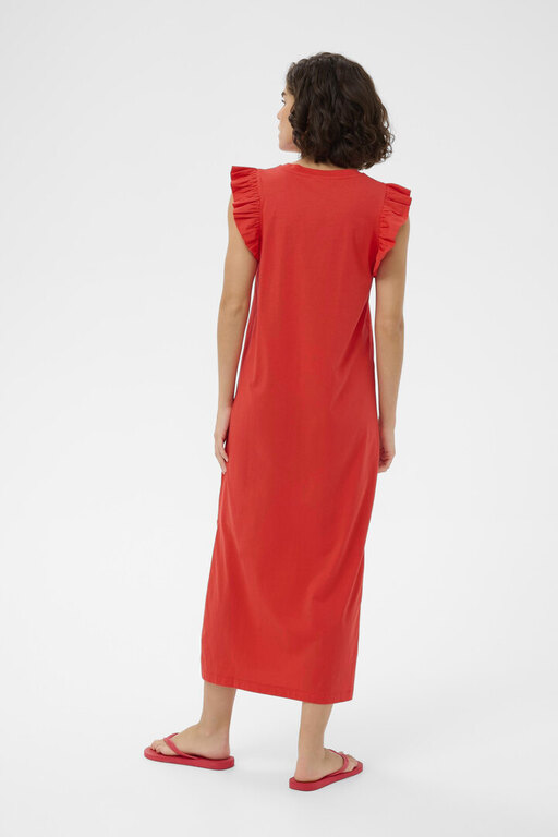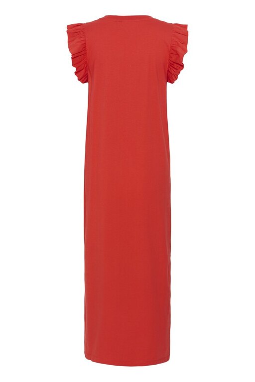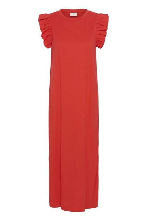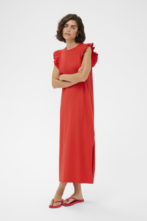 Celina on Kaffen suoralinjainen, pitkä mekko, jonka jujuna on röyhelöiset, pienet hihat. Helmassa halkiot kummassakin sivusaumassa. Materiaali 100% puuvillatrikoo.