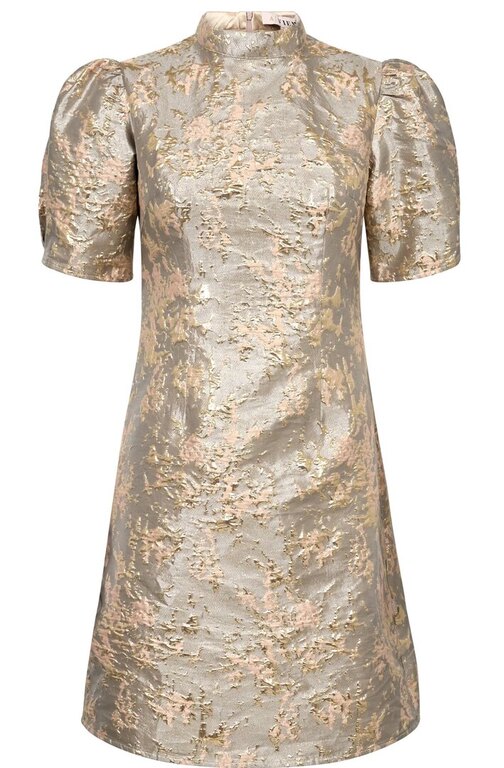 Bonnie-mekko on mini-mittainen, strukturoidusta jacquard-materiaalista valmistettu mekko. Mekko on vartalonmyötäinen ja siinä on lyhyet pussihihat. Pyöreä, korkea pääntie ja takana oleva vetoketju viimeistelevät ilmeen.