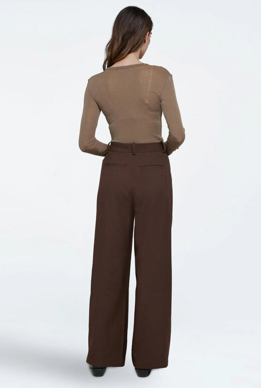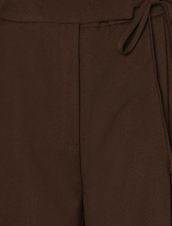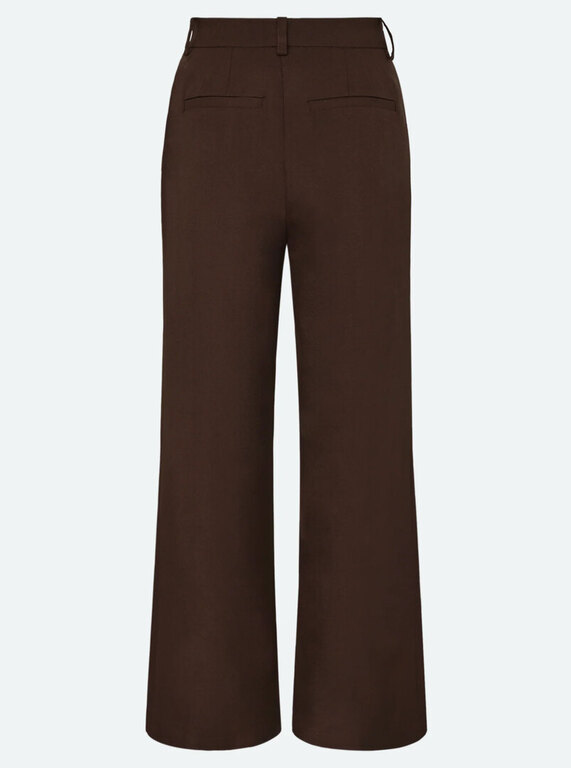 Gunli, Minimum. Leveälahkeiset suorat housut, korkea vyötärö, väljä istuvuus sekä edessä avoimet laskokset ja solmittavat nauhayksityiskohdat. Lisäksi housuissa on taskut ja kaksi valetakataskua. Materiaali 93 % kierrätetty polyesteri / 5 % viskoosi / 2 % elastaani.