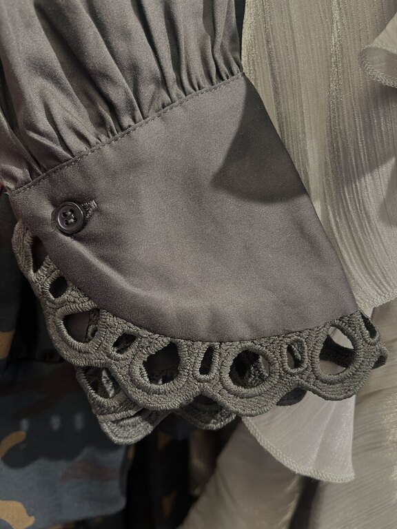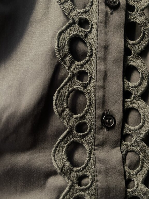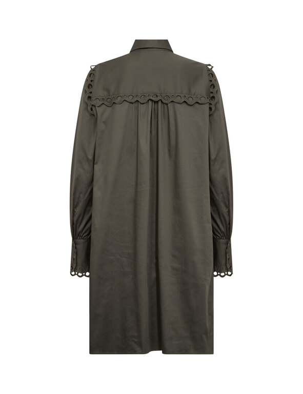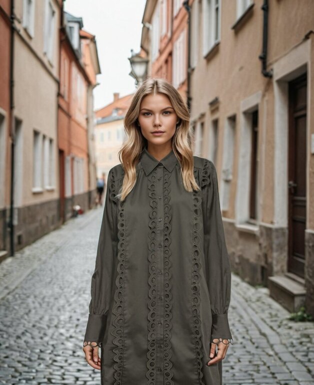 Leveten tyylikäs, lyhyt paitamekko, jossa on kaulus, hienostuneet pitsileikkaukset, nappilista, pitkät hihat napillisilla kalvosimilla sekä pitsiyksityiskohtia. Mekon pituus ulottuu polveen. Taskut sivusaumoissa. Monipuolinen design mahdollistaa yhdistämisen sekä mataliin kenkiin että korkokenkiin, tehden siitä sopivan moniin eri tilanteisiin. Taskut. Materiaali 65% luomupuuvilla-30% polyamidi-5% elastaani. Sävy tumma vihreä.