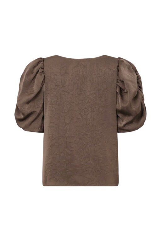 Sinda on elegantti pusero, jossa on pyöreä pääntie ja lyhyet pussihihat. Puserossa on kevyesti strukturoitu pinta ja naisellinen siluetti, rennolla ja väljällä istuvuudella.