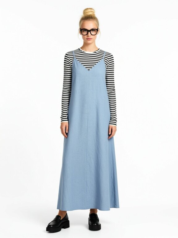 Leveten LENNON on yksinkertainen ja ajaton maksimittainen mekko, joka on valmistettu 95 % luomupuuvillasta ja 5 % elastaanista. Helposti puettava slip-on-malli, jossa on säädettävät spagettiolkaimet, v-pääntie ja väljä, kauniisti laskeutuva muotoilu. Denim-kuosinen kangas tuo mekkoon rennon mutta huolitellun ilmeen.