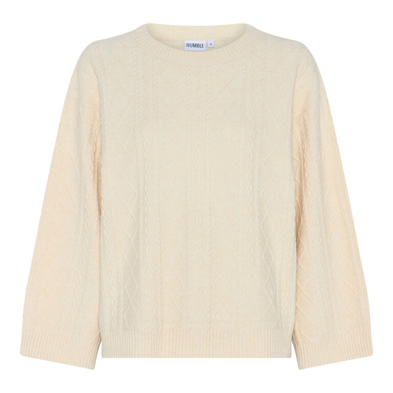 Nobel on Humblen pehmeä palmikkoneule, materiaali neulosseos (56% puuvilla-40% polyesteri-4% elastaani). Boksimainen malli, hiha leveä.