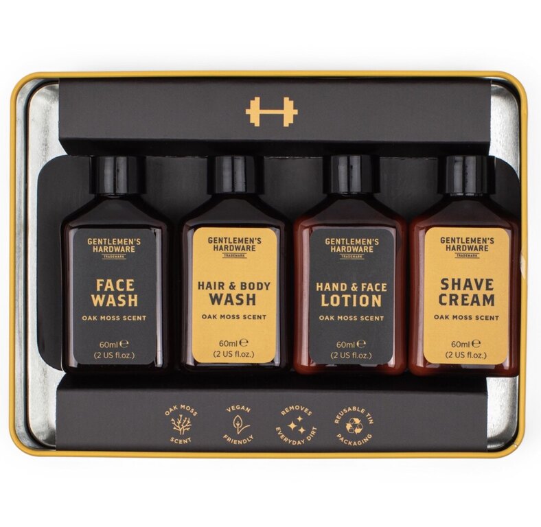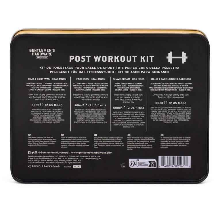 Miehille suunnattu after gym-setti, jossa peltirasiassa