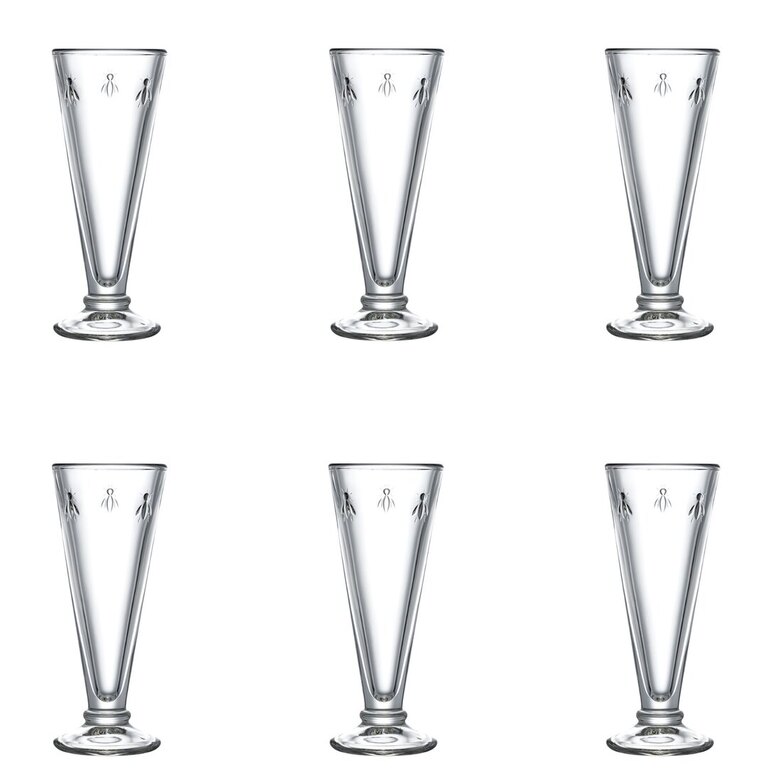 Shampanjalasit Abeille, 6 kpl. Valmistaja ranskalainen La Rochère, koristeltu Napoleonin mehiläisaiheella. Täydellinen shamppanjalle, kuohuviinille ja cocktaileille, kuten bellinille ja mimosalle. Tilavuus 15 cl.