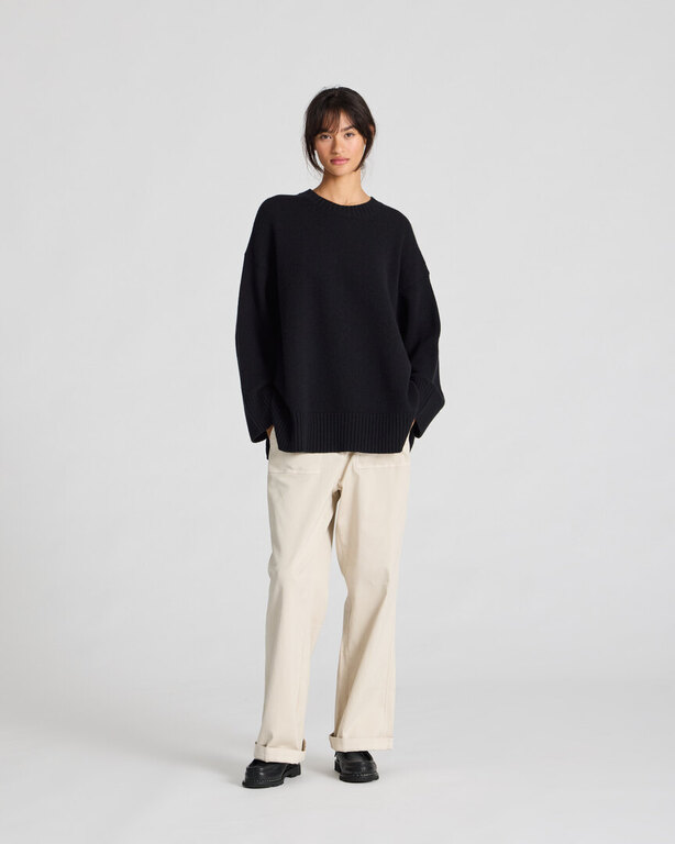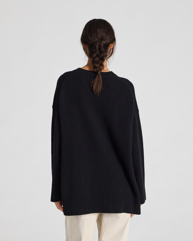Vigga on Gai+Lisvan suoralinjainen, väljä perusneule, materiaali 100% gots-sertifioitu lampaanvilla. Pyöreä pääntie.