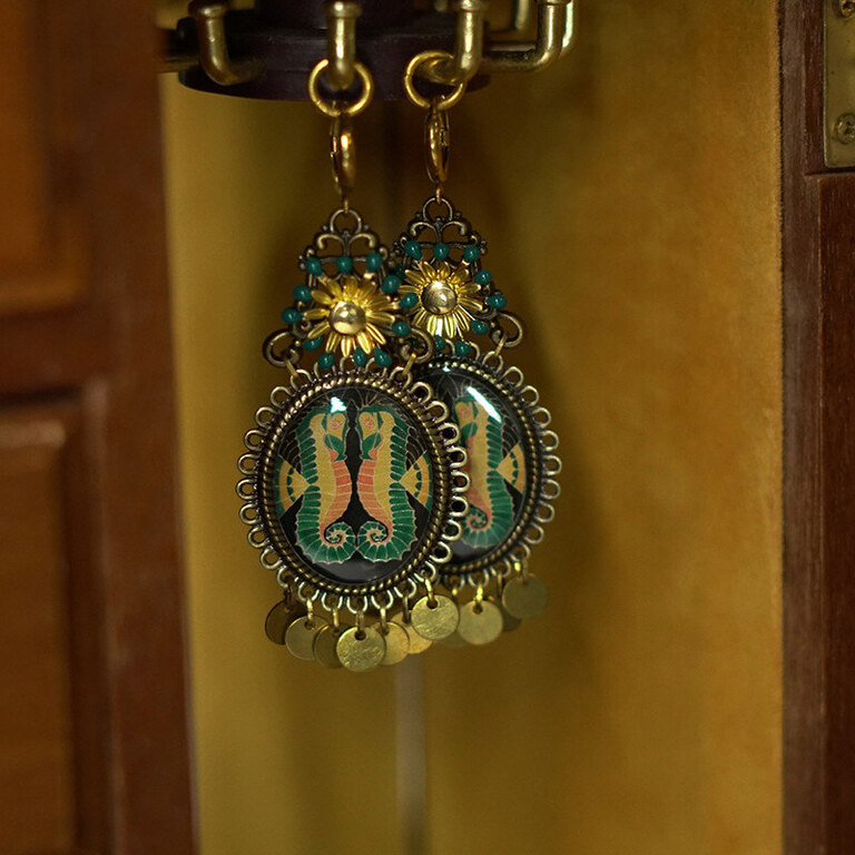 Huom! Kuvioinnin pinnassa oleva hartsi voi vaurioitua hiuslakan ja parfyymin vaikutuksesta. Laittaudu siis ensin ja pue korvakorut vasta sen jälkeen.