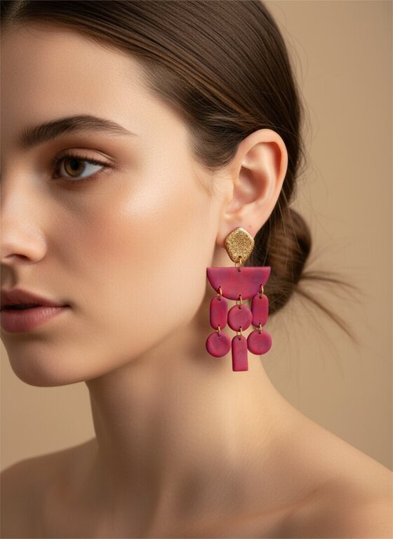 Höperön polymeerimassasta käsityönä tehdyt korvakorut. Metalliosat terästä. Korkeus noin 7 cm, leveys noin 5 cm.