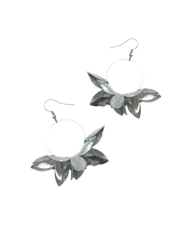 Hilja-korvisten terälehdet ovat nahkapaperia ja muut osat korumetallia. Kokopituus 7,5 cm, leveys leveimmillään n. 5,5 cm.