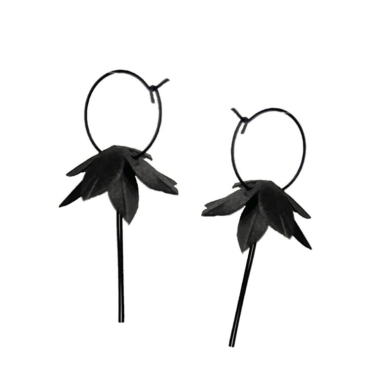 Hilja-korvisten terälehdet ovat nahkapaperia ja muut osat korumetallia. Kokopituus 7,5 cm, leveys leveimmillään n. 5,5 cm.